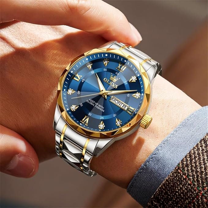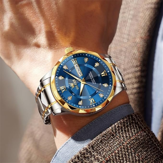 Elevate your style with the OLEVS Men’s Business Watch. This luxury timepiece features a sophisticated gold and blue design, perfect for making a statement at any occasion. Its sleek stainless steel band is not only durable but also adds a touch of refinement to your wrist.